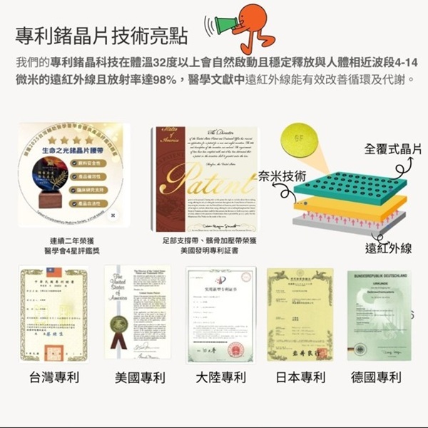 鍺晶片接觸人體時會產生溫熱效果,再搭配透氣機能布,